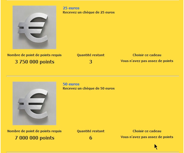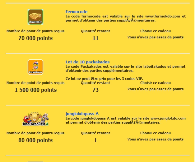 Usted verá en todas las diez categorías enumeradas, vamos a mencionar algunos: - Gana DVD; - Gane códigos (byncode, findcode, paquete de + ...) - Ganar los juegos de video; - Ganar dinero; - Más información más regalos en detalle en el sitio de juegos LaBoitaKados.com.